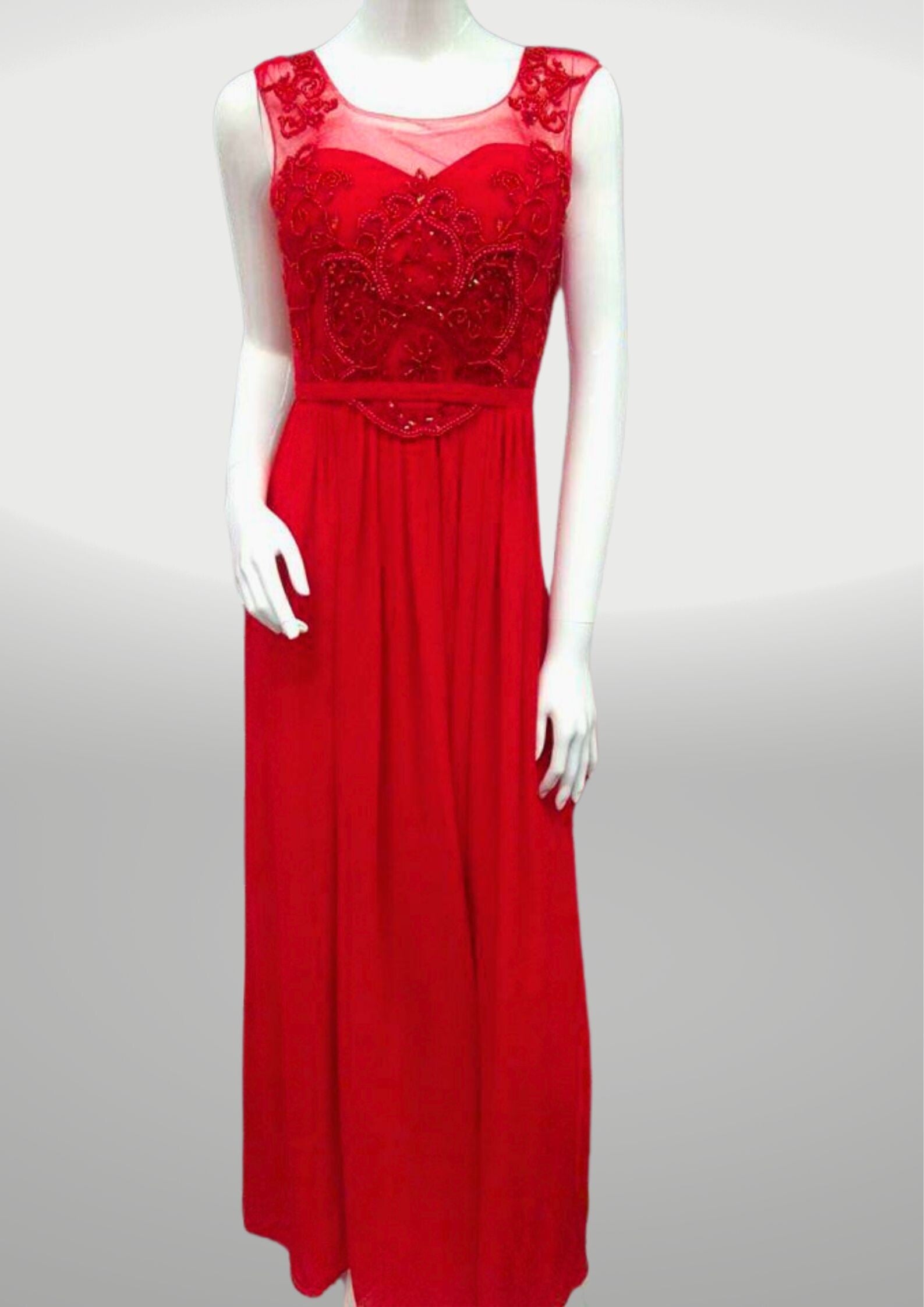 Suknia z koronkowa zdobiona gora. Z tylu w tali ma wszyte gumeczki dziek ktorym dealnie dopasowuje sie do sylwetki.Ma wszyte miseczk , zapinana goku na zamek.