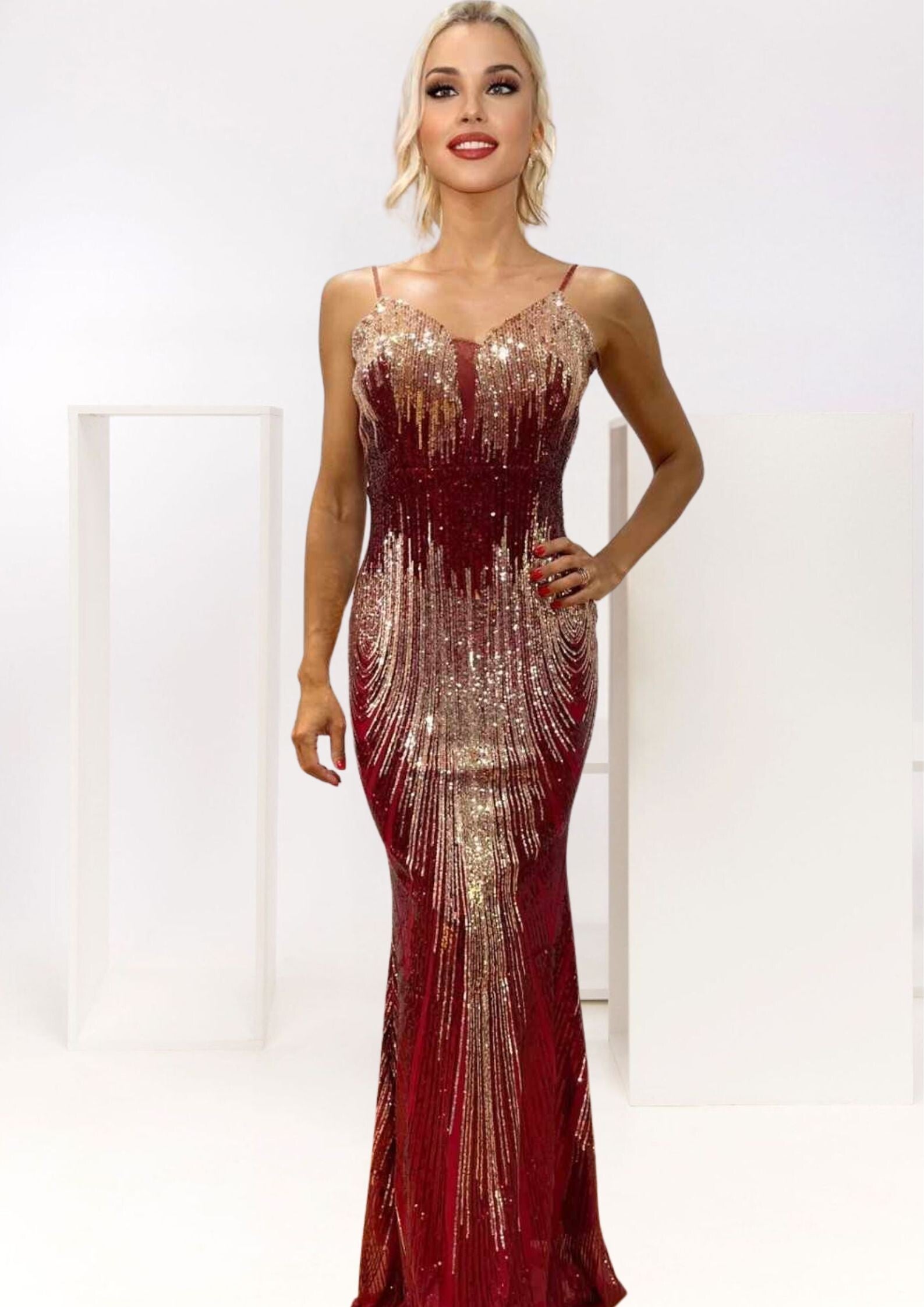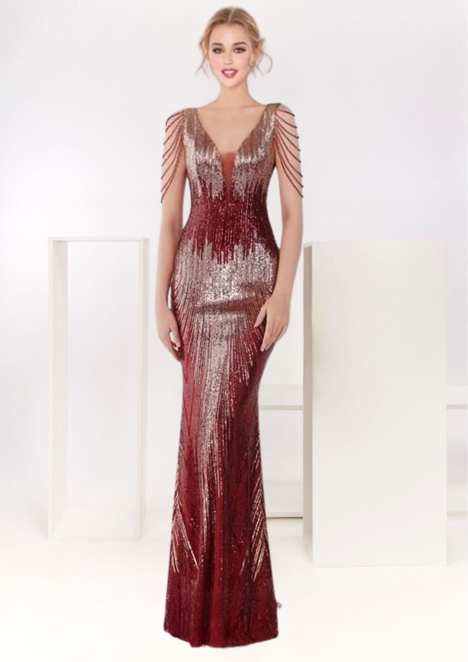 Dluga , elastycna cekinowa suknia.Na ramionach sznury drobnych koralikow. zpinana na zamek.Ma wszyty push up