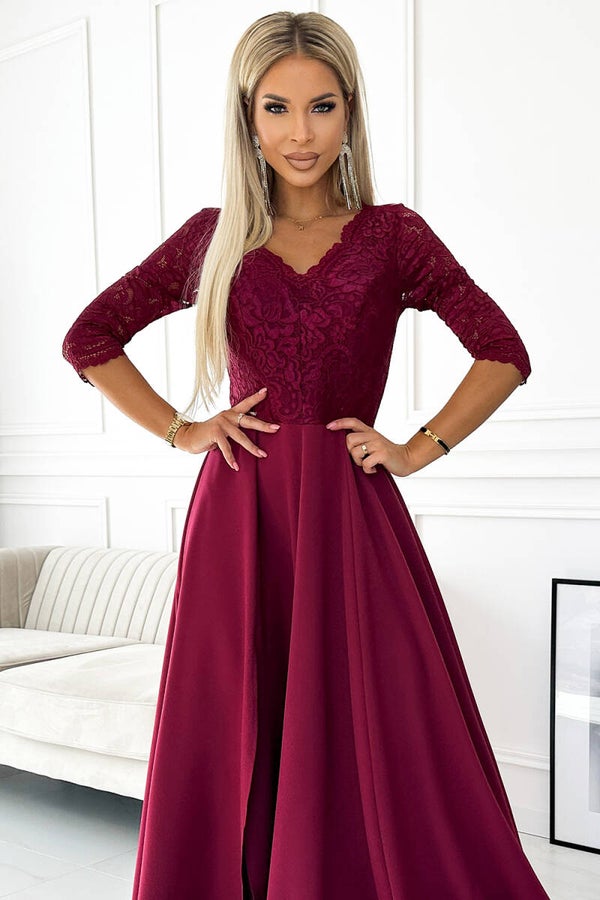 Elegancka, długa, koronkowa suknia z dekoltem. Pięknie wyprofilowany dekolt i rozcięcie na spódnicy