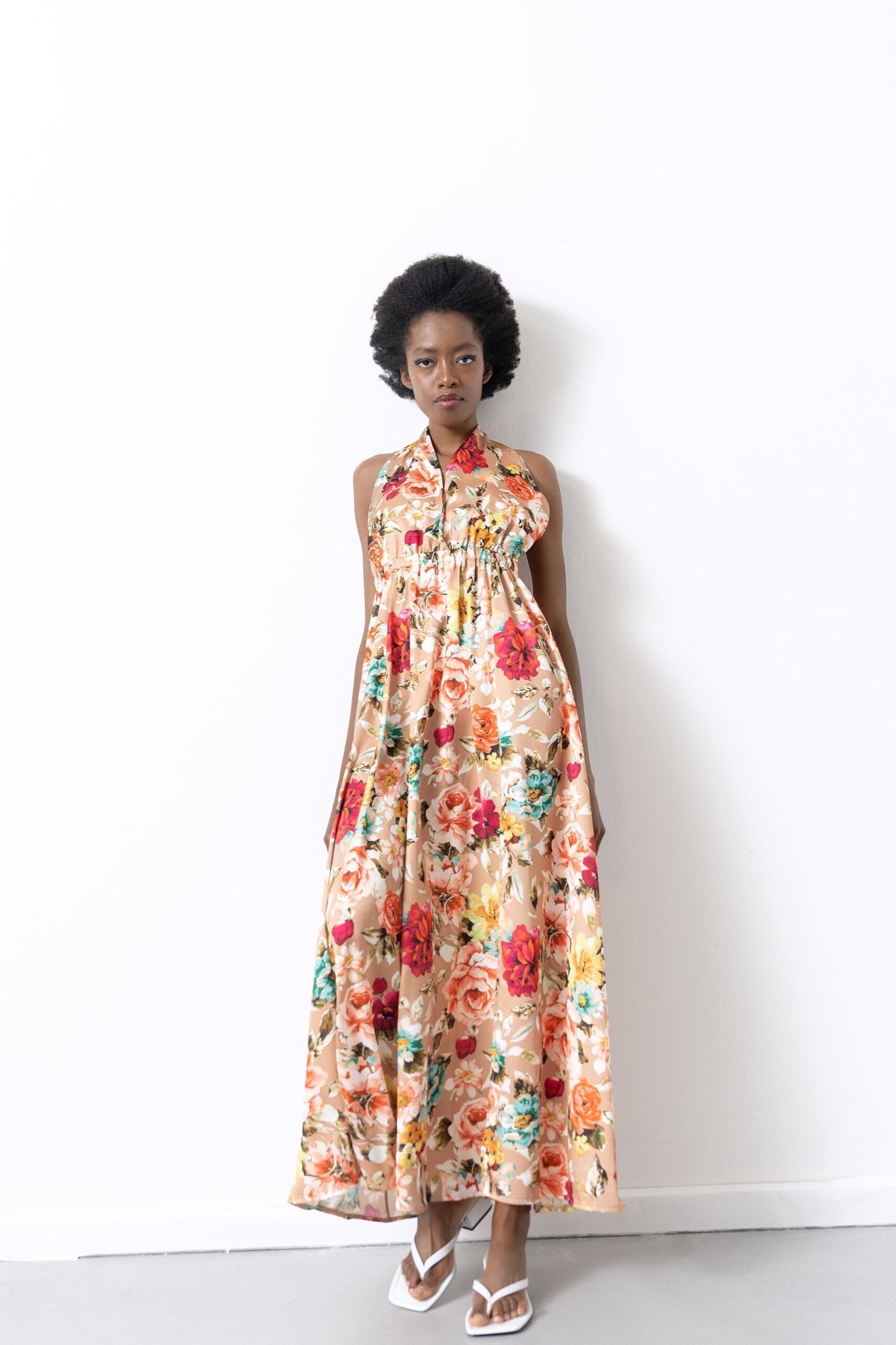 Dluga sukienka z guma w pasie i rozcieciem na spodnicy. Gora wiazana na szyi. Doskonala na co dzien , na plaze a takze z odpowiednimi dodatkami na wieczor.