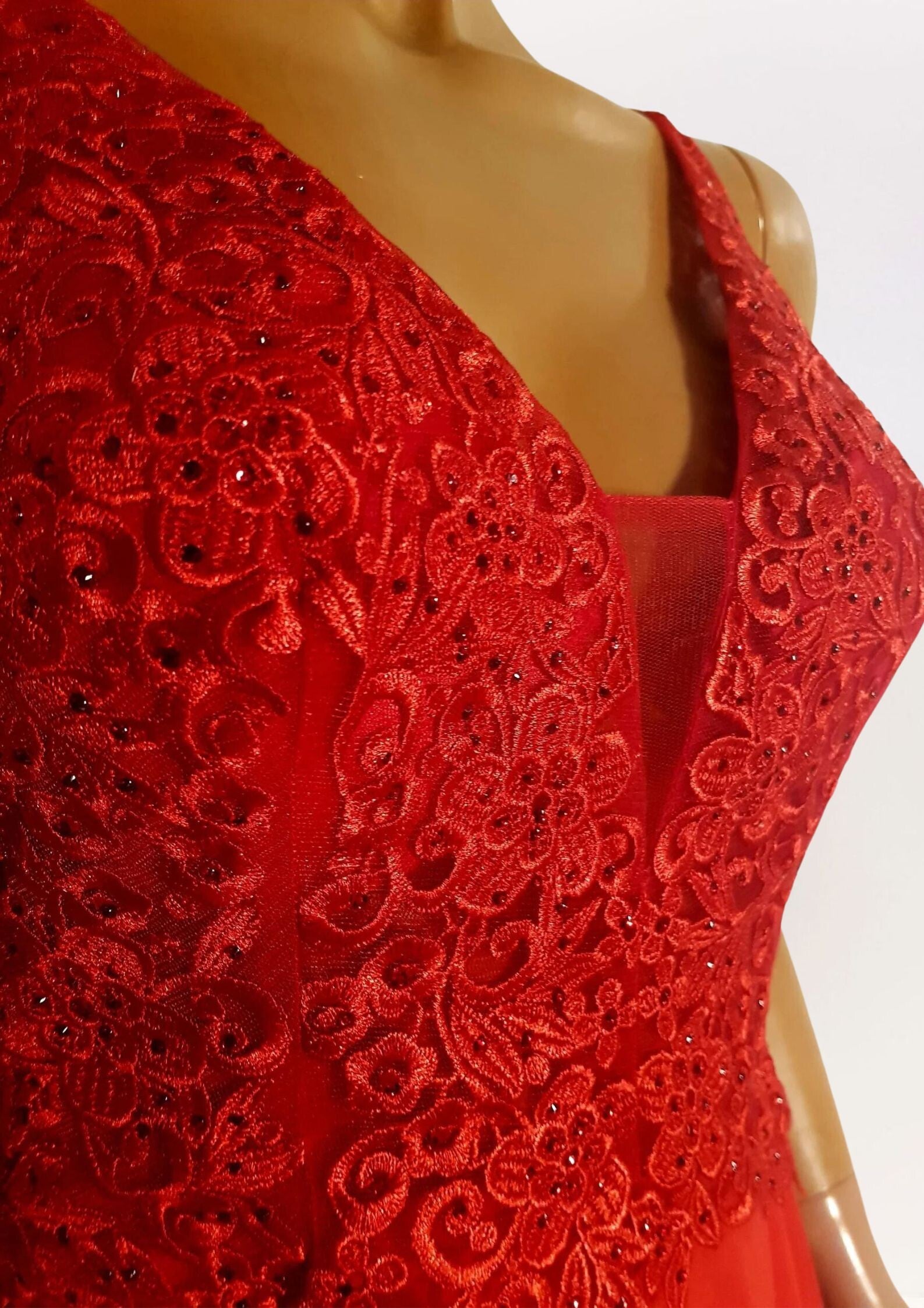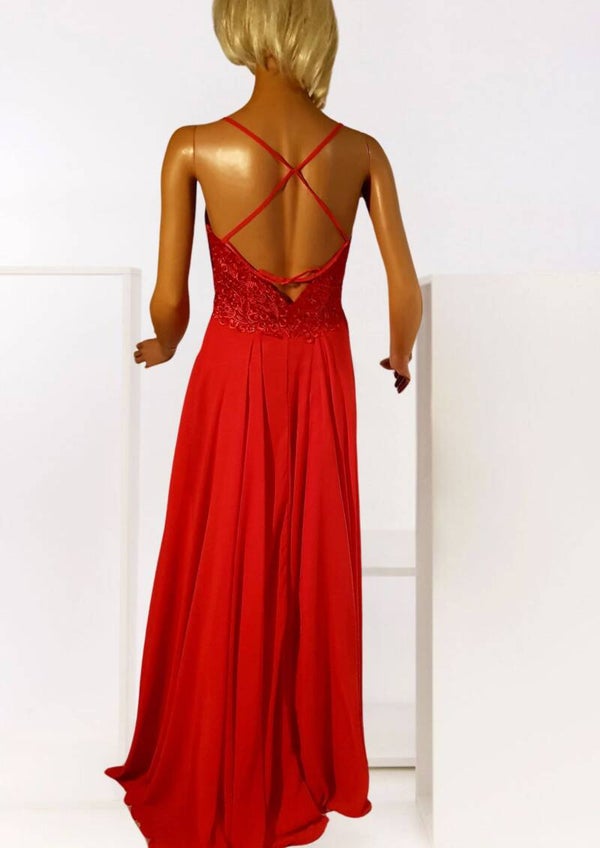 Czerwona wieczorowa sukienka z koronkowa gora . Posiada cienkie ramiaczka i gleboki dekolt na plecach. Dol uszyty z lejacej tkaniny gora sukienki uszyta z koronki zdobionej strasem. Dol z lejacego materialu ,posiada rozciecie na spodnicy, Zapinana z boku na kryty zamek