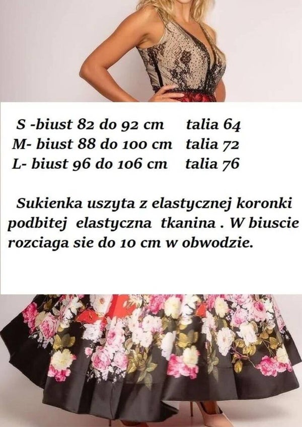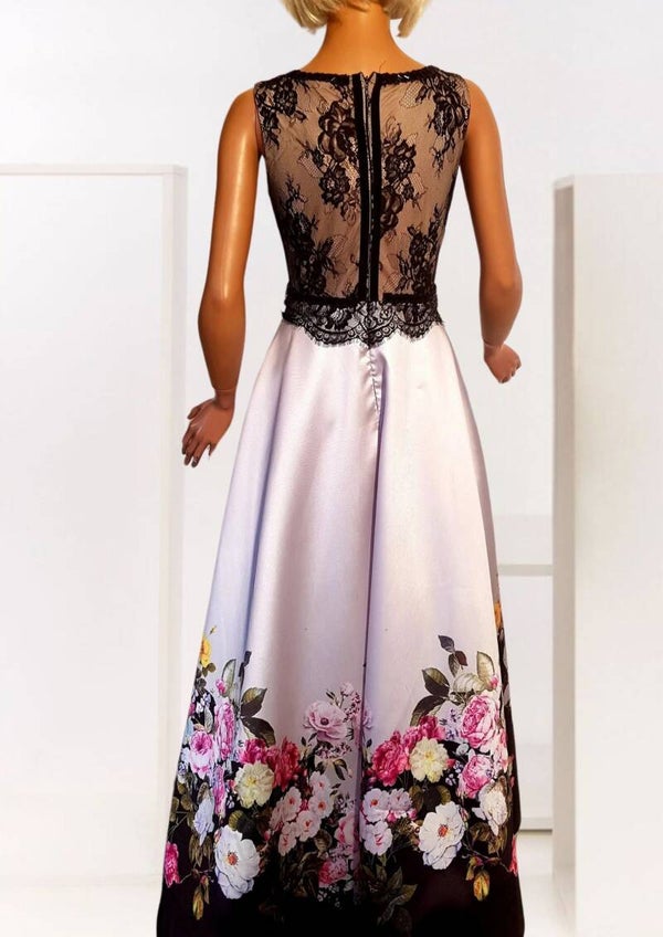 Dluga sukieka z kwiatowym worem na spodnicy . Gora ozdobiona francuska koronka z kamyczkami Suknia zapinana z tylu na kryty zamek W talii i przy wykonczeniu dekoltu ozdobna tasma naszyta kamyczkami
