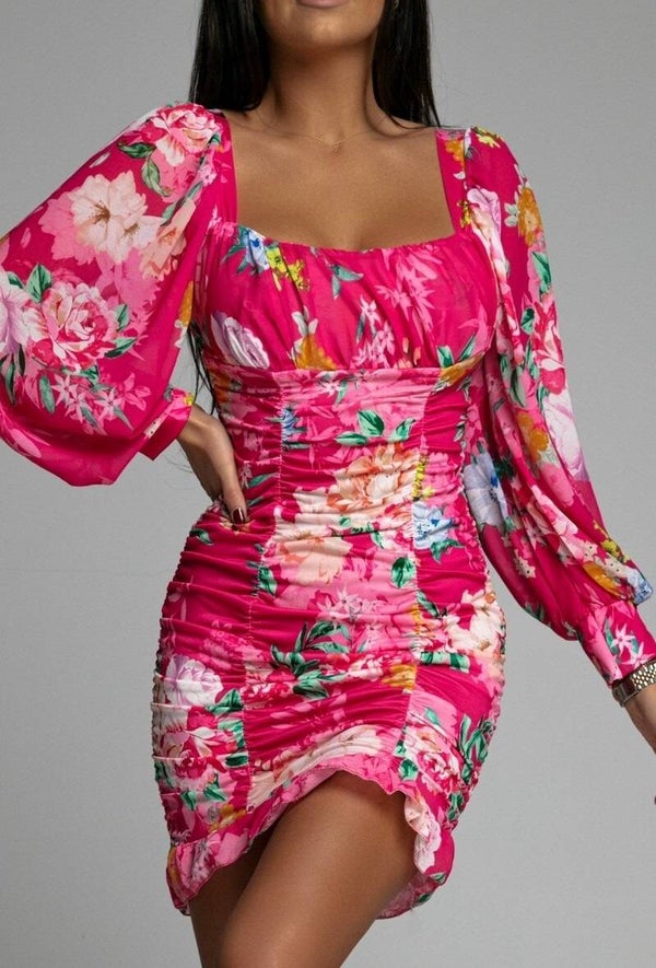 Delikatnie drapowana sukienka z dlugim bufiastym rekawem , mocno elastyczna . Rozmiar UNI , pasuje na S M L XL