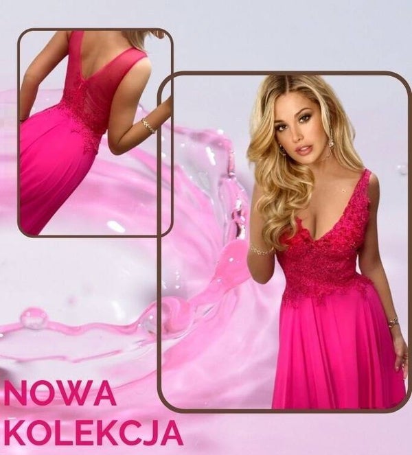 Dluga sukienka w kolorze fuksji z koronkowa gora . Lekko przezroczysta na bokach co swietnie podkresla i wysmukla sylwetke. . Ma wszyte miseczki , tyl zapinany na zamek.