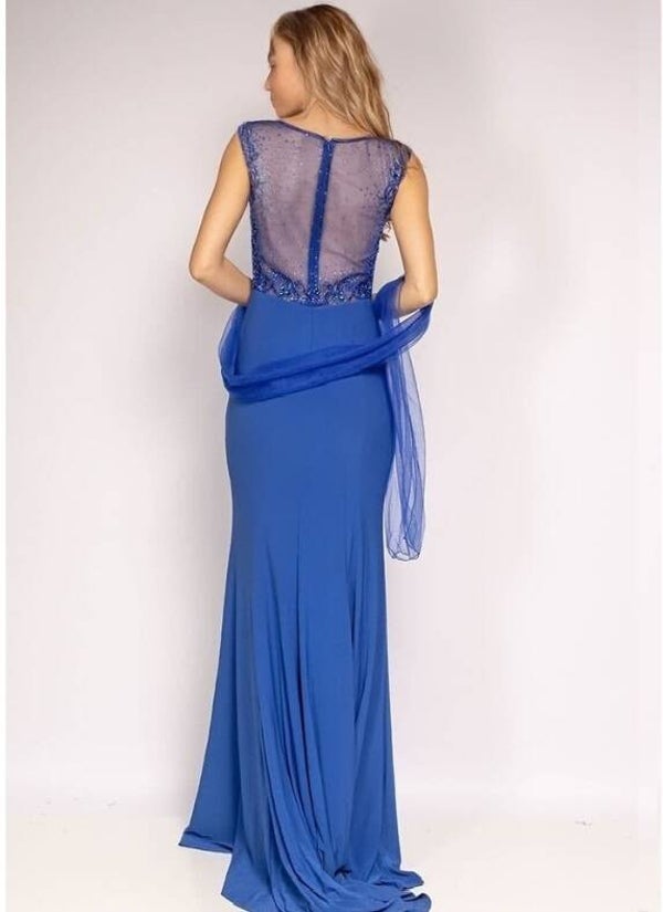 Bardzo elegancka i kobieca suknia uszyta z elastycznej tkaniny w kolorze niebieskim. Na dekolcie z przodu i na plecach siateczka ozdobiona kamykami i perelkami.Zapinana na zamek. Sukienka ma wszyte miseczki.